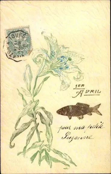 Ak 1. April, Ier Avril, Blüte, Fisch, Lilie