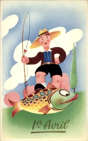 Ak 1. April, Junge mit Fisch