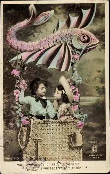 Ak 1. April, Kinder in einem Ballon, Fisch