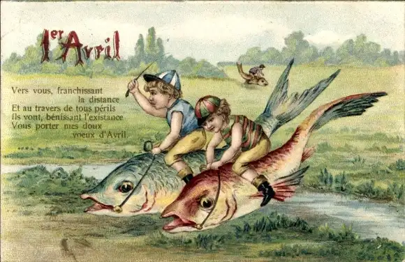 Ak 1er Avril, 1. April, Kinder reiten auf Fischen