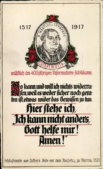 Ak 400jähriges Reformationsjubiläum, Luther, Zitat, So kann und will ich nichts widerrufen...