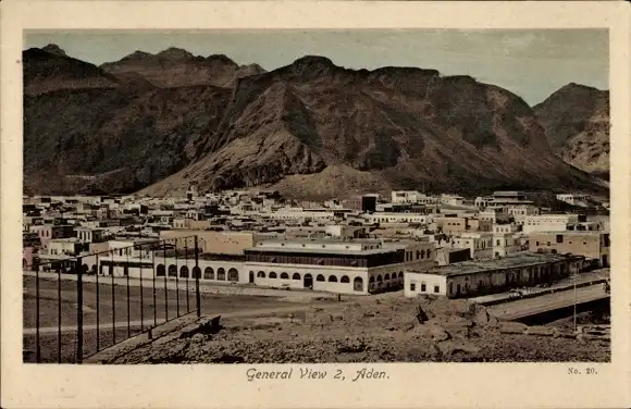 Ak Aden Jemen, Blick auf im Vordergrund ein Zaun, dahinter eine Stadt, dahinter Berge