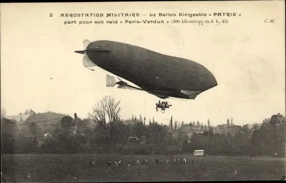 Ak Aérostation militaire, Ballon Dirigéable Patrie, Raid Paris Verdun, Französisches Luftschiff
