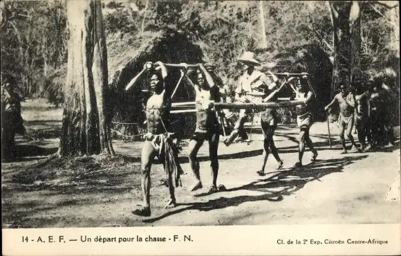 Ak Afrika, Kolonist wird von afrikanischen Männern zur Jagd getragen