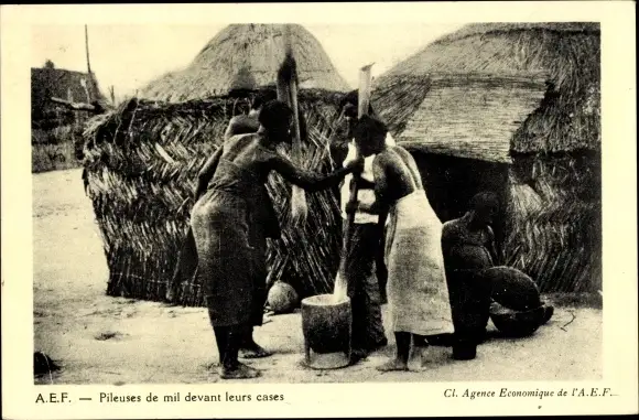 Ak Afrika, Pileuses de mil devant leurs cases