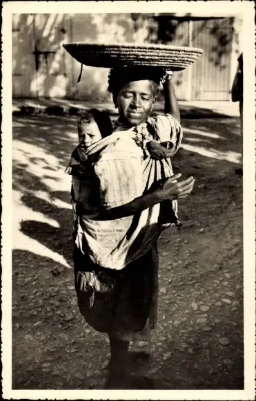 Ak Afrikanerin mit Kind, Portrait, Korb