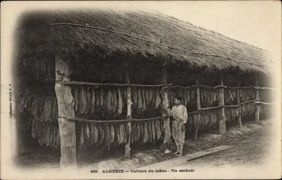 Ak Algerien, Culture du tabac, Un sechoir, trocknende Tabakblätter