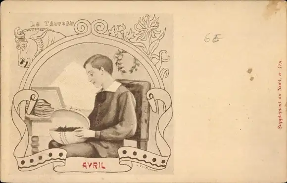 Ak Allegorie, April, Junge mit Osterei, Sternzeichen Stier
