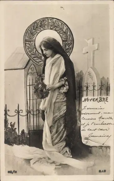 Ak Allegorie, Frau mit Blumenkranz, Kirche, Friedhof
