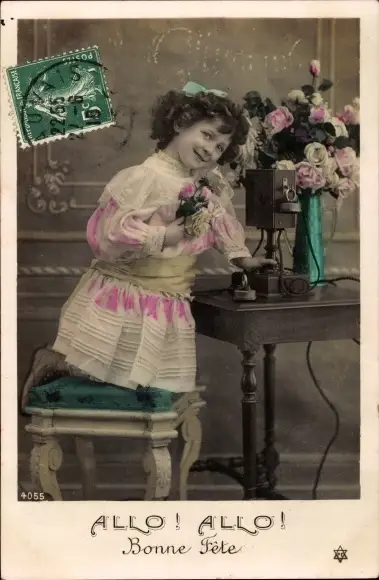 Ak Allo, Allo! Bonne Fete, Mädchen am Telefon, Blumenvase