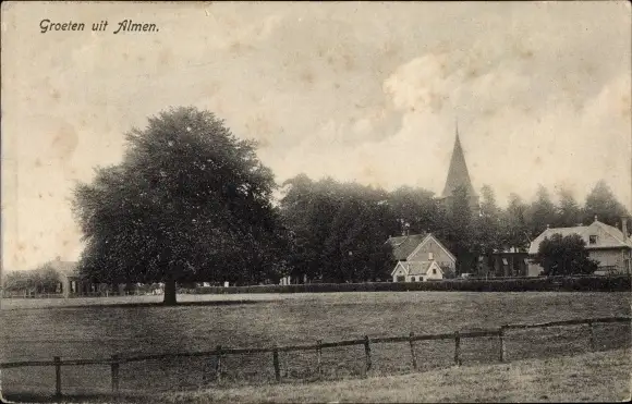 Ak Almen Gelderland, Wohnhäuser, Kirchuturm, Baum