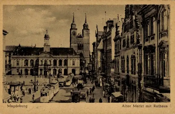 Ak Alte Neustadt Magdeburg, Alter Markt mit Rathaus, Straßenbahn, Personen