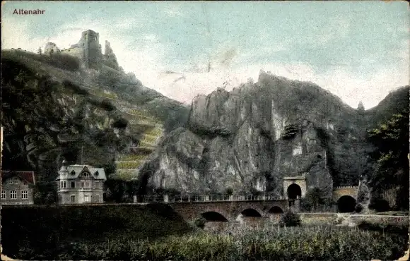 Ak Altenahr, Blick zum Ort, Burg, Brücke, Felsen, Häuser
