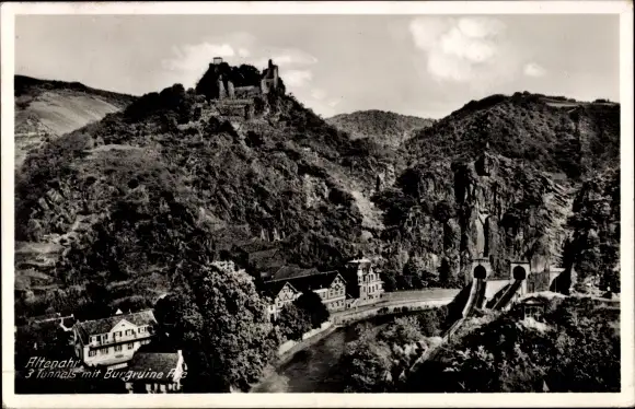 Ak Altenahr im Ahrtal, 3 Tunnels mit Burgruine Are