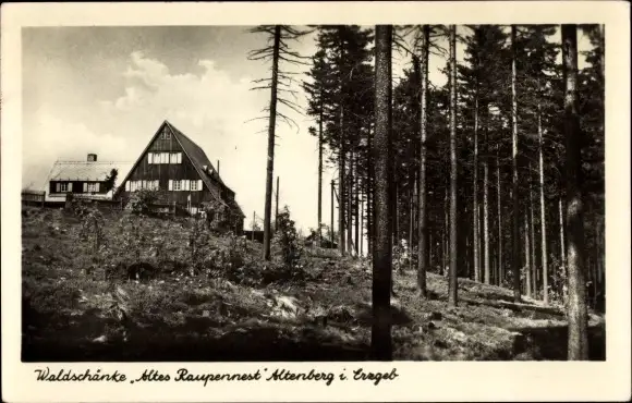 Ak Altenberg im Erzgebirge, Waldschänke Altes Raupennest, Nadelwald