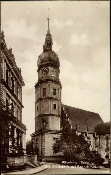 Ak Altenburg in Thüringen, Thüringische Staatsbank mit Bartholomäikirche