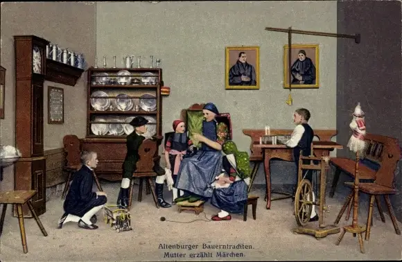 Ak Altenburger Bauerntrachten, Mutter erzählt Märchen, Spinnrad