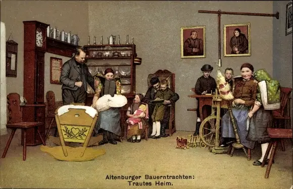 Ak Altenburger Bauerntrachten, Trautes Heim, Spinnrad, Babywiege
