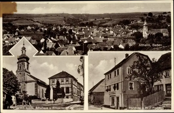 Ak Altheim in Baden, Gesamtansicht, Kirche, Schulhaus, Kriegerdenkmal, Handlung Fr. J. Probst