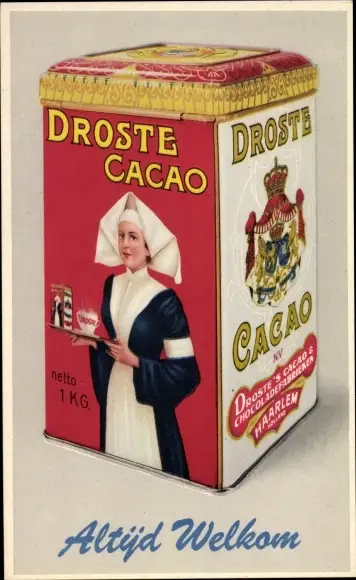 Ak Altijd Welkom, Holländischer Import Kakao von Droste, Niederländerin mit Tablett, Wappen