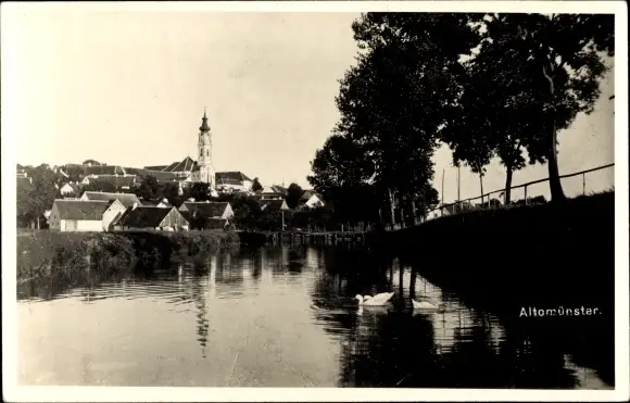 Ak Altomünster in Oberbayern, Flusspartie, Im Hintergrund Rathausturm