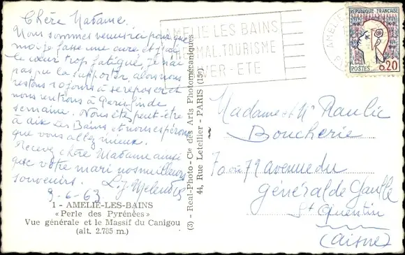 Ak Amelie les Bains Pyrénées Orientales, Vue generale et le Massif du Canigou