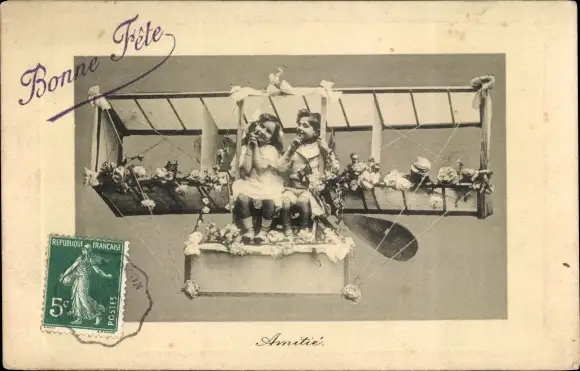 Ak Amitie, Zwei Mädchen in einem Flugzeug, Doppeldecker