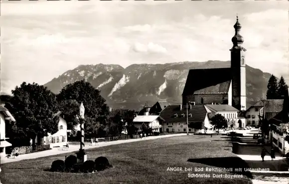 Ak Anger in Oberbayern, Teilansicht, Kirche, Untersberg