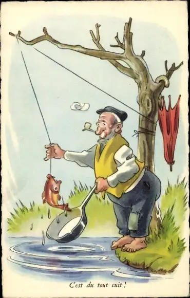 Ak Angler hat Fisch am Haken, Bratpfanne