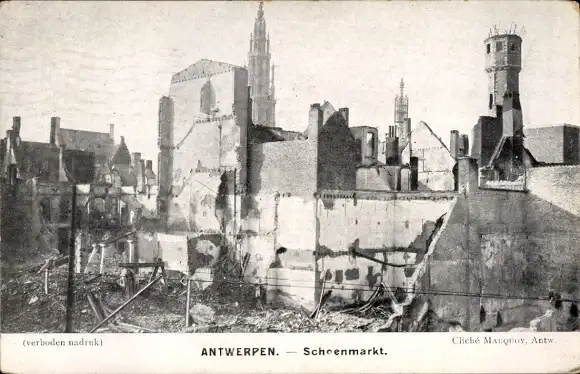 Ak Antwerpen Anvers Flandern, Schoenmarkt, zerstörte Häuser