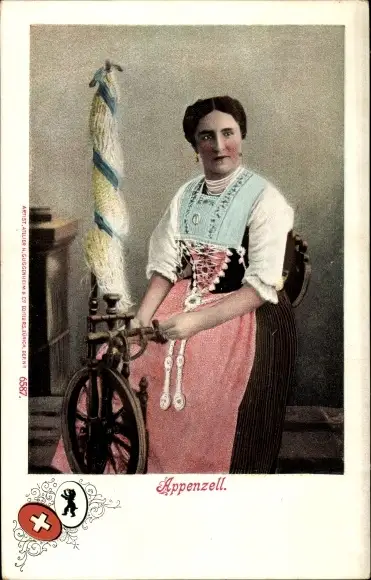 Ak Appenzell, Frau in Volkstracht am Spinnrad, Wappen