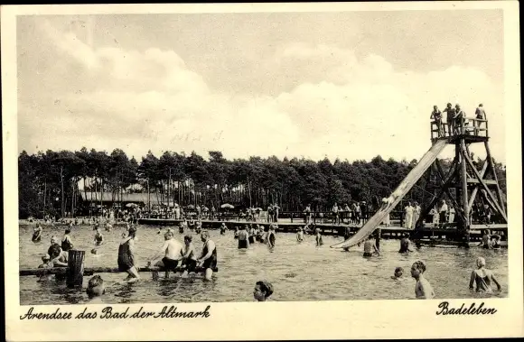 Ak Arendsee in der Altmark, Schwimmbad, Badeleben, Wasserrutsche