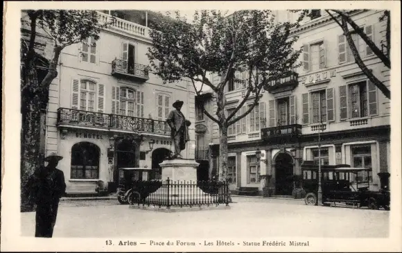 Ak Arles Bouches du Rhône, Place du Forum, Les Hotels, Statue Frederic Mistral