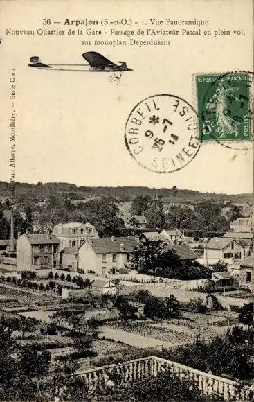 Ak Arpajon Essonne, Neues Viertel des Bahnhofs, Flugzeug Aviateur Pascal, Monoplan Deperdussin