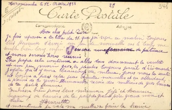 ungelaufen, Rückseite beschrieben, datiert 1938, sehr guter Zustand
