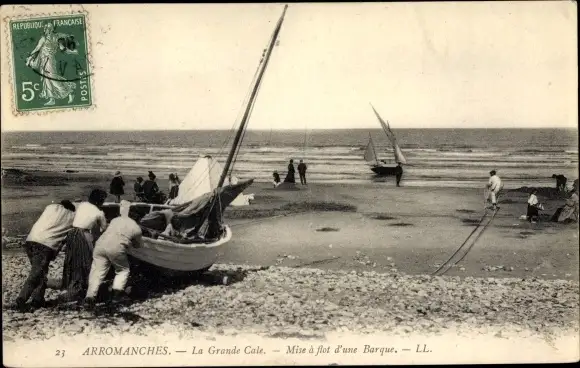 Ak Arromanches Calvados, la Grande Cale, Mise à flot d'une barque, Segelboote