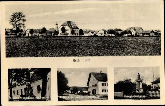 Ak Asch Landsberg am Lech in Oberbayern, Florian Monument, Schule, Kriegerdenkmal, Geschäft