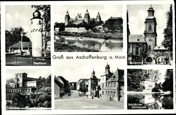 Ak Aschaffenburg in Unterfranken, Stadtturm, Freihofsplatz, Schlösschen Schönbusch, Sandkirche