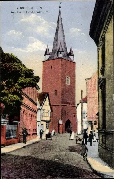 Ak Aschersleben im Salzlandkreis, Am Tie mit Johannisturm
