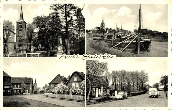 Ak Assel Drochtersen Elbe, Kirche, Hafen, Straßenpartie, Auto