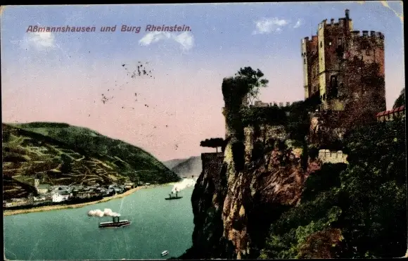 Ak Assmannshausen Rüdesheim am Rhein, Burg Rheinstein, Dampfer