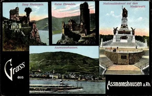 Ak Assmannshausen Rüdesheim am Rhein, Burg Rheinstein, Ruine Ehrenfels, Nationaldenkmal