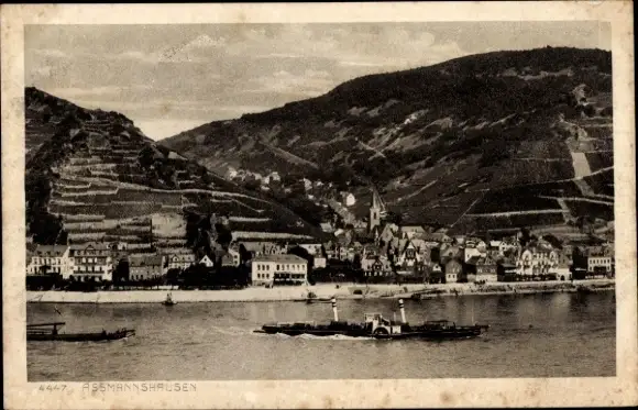 Ak Assmannshausen Rüdesheim am Rhein, Totalansicht, Kirchturm, Dampfer