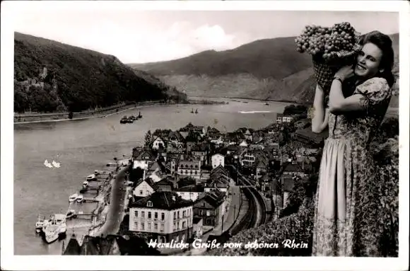 Ak Assmannshausen Rüdesheim am Rhein, mit Rheinstein, Frau mit Weintrauben
