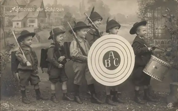 Ak Aufmarsch der Schützen, Kinder in Uniformen, Gewehr, Schießscheibe