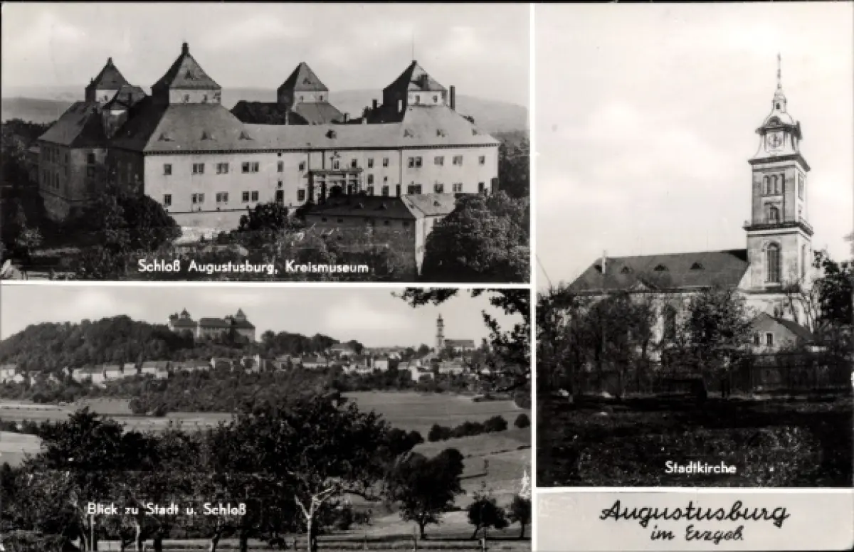 Ak Augustusburg im Erzgebirge, Schloss, Kreismuseum, Stadtkirche, Ortsansicht