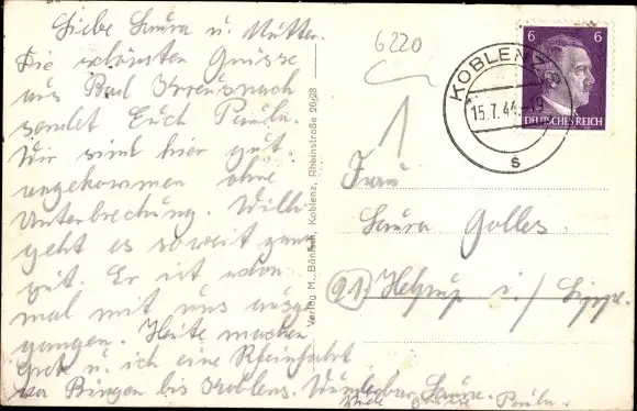 Zustand, siehe Scan, gelaufen, 1944 - ca 14 cm X 9 cm