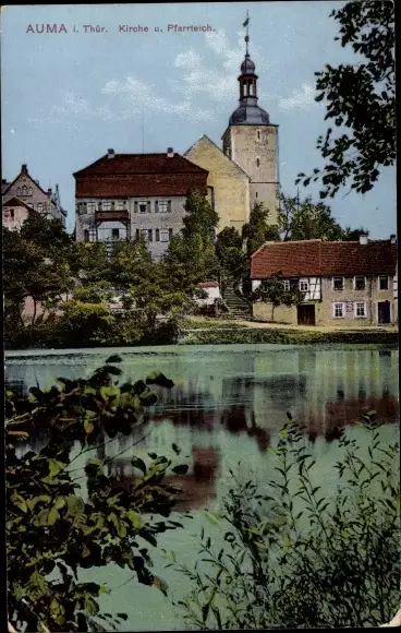Ak Auma in Thüringen, Kirche und Pfarrteich