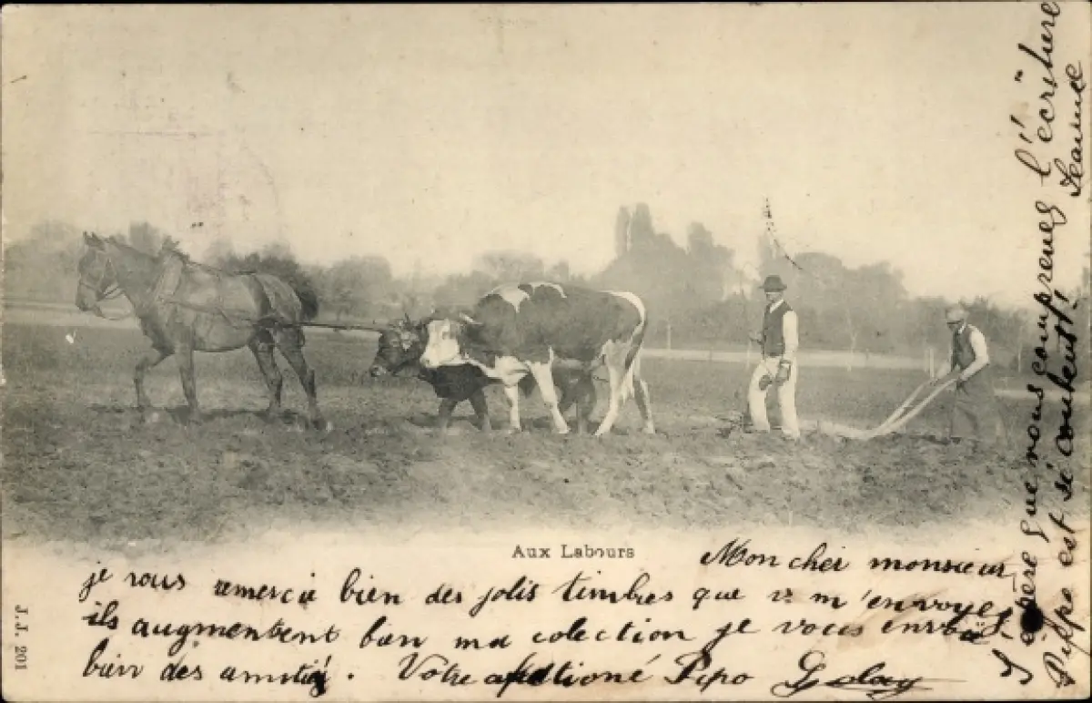 Ak Aux Labours, Rinderpflug, Bauern