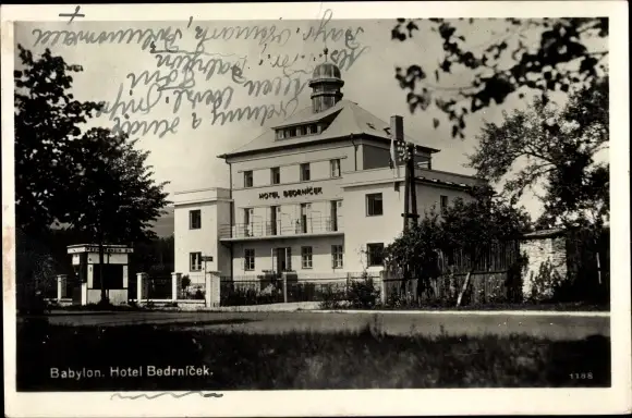 Ak Babylon, Blick aufs Hotel Bedrnicek mit Bäumen